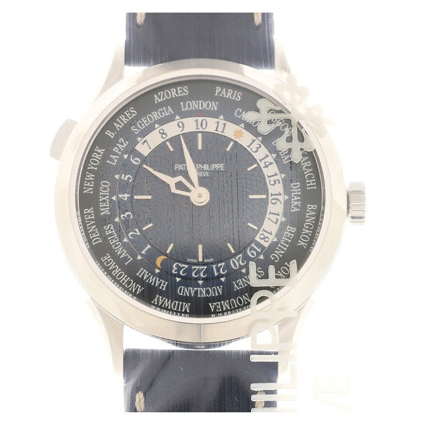 Platinum case with a blue suede leather strap. Platinum platinum bezel. Blue dial with silver-tone hands and index-Arabic numeral hour markers. Dial Type: Analog. Two sub-dials displaying: word time and day/night indicator. Patek Philippe Calibre 240 HU Automatic movement, based upon Patek Philippe 240, containing 33 Jewels, composed of 239 parts, bitting at 21600 vph, and has a power reserve of approximately 48 hours. Scratch resistant sapphire crystal. Transparent see through case back. Case size: 38.5 mm, case thickness: 10.23 mm. Deployment clasp. Water resistant at 30 meters / 100 feet. Functions: world time, GMT, second time zone, hour, minute, day/night indicator. Additional Info: original box, manual (complete accessories). Complications Series. Luxury watch style. Watch label: Swiss Made. Patek Philippe Complications World Time Automatic Blue Dial Men’s Watch 5230P-001.