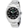 Stainless steel case with a stainless steel bracelet. Fixed stainless steel bezel. Black dial with luminous silver-tone Mercedes-logo, sword, and Breguet-style shape hands and index hour markers. Arabic numeral hour markers at the 3, 6 and 9 o’clock positions. Arabic numeral minute markers (at 5 minute intervals). Minute markers around the outer rim. Dial Type: Analog. Rolex calibre 3131 automatic movement with a 48-hour power reserve. Scratch resistant sapphire crystal. Screw down crown. Solid case back. Round case shape. Case size: 40 mm. Oysterlock clasp. Water resistant at 100 meters / 330 feet. Functions: hour, minute, second, chronometer. Luxury watch style. Watch label: Swiss Made. Rolex Air King Black Dial Stainless Steel Men’s Watch 116900BKAO.