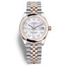 Silver-tone stainless steel case with a two-tone (silver-tone and rose gold-tone) stainless steel and 18kt everose gold jubilee bracelet. Domed 18kt everose gold bezel. Mother of pearl dial with everose gold hands and diamonds hour markers. Dial Type: Analog. Date display at the 3 o’clock position. Rolex Calibre 2236 Automatic movement, based upon Rolex 2235, containing 31 Jewels, bitting at 28800 vph, and has a power reserve of approximately 55 hours. Scratch resistant sapphire crystal. Screw down crown. Solid case back. Round case shape, case size: 31 mm. Folding clasp. Water resistant at 100 meters / 330 feet. Functions: date, hour, minute, second. Datejust 31 Series. Luxury watch style. Watch label: Swiss Made. Rolex Datejust 31 Mother of Pearl Diamond Dial Automatic Steel and 18kt Everose Gold Jubilee Watch 278241MDJ.
