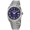 Stainless steel case with a stainless steel Rolex jubilee bracelet. Fixed fluted 18kt white gold fluted bezel. Aubergine dial with silver-tone hands and Roman numeral hour markers. Diamond-set Roman numerals appear at the 6 and9 o’clock positions. Minute markers around the outer rim. Dial Type: Analog. Date display at the 3 o’clock position. Rolex calibre 3235 automatic movement, based upon Rolex 3035, containing 31 Jewels, bitting at 28800 vph, and has a power reserve of approximately 70 hours. Scratch resistant sapphire crystal. Screw down crown. Solid case back. Round case shape. Case size: 36 mm. Oysterlock clasp. Water resistant at 100 meters / 330 feet. Functions: date, hour, minute, second, chronometer. Datejust 36 Series. Luxury watch style. Watch label: Swiss Made. Rolex Datejust 36 Automatic Aubergine Diamond Dial Ladies Jubilee Watch 126234AURDJ.