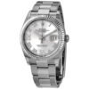 Stainless steel and 18k white gold case with a stainless steel rolex oyster bracelet. Fixed fluted stainless steel and 18kt white gold fluted bezel bezel. Silver dial with silver-tone hands and Roman- diamonds numeral hour markers. Dial Type: Analog. Date display at the 3 o’clock position. Rolex Calibre 3235 automatic movement with a 70-hour power reserve. Scratch resistant sapphire crystal. Screw down crown. Solid case back. Round case shape. Case size: 36 mm. Oysterlock clasp. Water resistant at 100 meters / 330 feet. Functions: date, hour, minute, second. Luxury watch style. Watch label: Swiss Made. Rolex Datejust 36 Silver Diamond Dial Automatic Ladies Oyster Watch 126234SRDO.