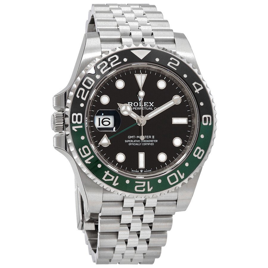 Silver-tone oystersteel case with a silver-tone oystersteel rolex jubilee bracelet. Bi-directional rotating green and black bezel. Black dial with silver-tone hands. Dial Type: Analog. Luminescent hands and markers. Date display at the 9 o’clock position. Rolex Calibre 3285 Automatic movement, based upon Rolex 3255, containing 31 Jewels, bitting at 28800 vph, and has a power reserve of approximately 70 hours. Scratch resistant sapphire crystal. Screw down crown. Round case shape, case size: 40 mm. Folding oysterlock clasp. Water resistant at 100 meters / 330 feet. Functions: GMT, second time zone, hour, minute, second, date, 24-hour graduated bezel. Gmt-master II Series. Luxury watch style. Watch label: Swiss Made. Rolex GMT-Master II Automatic Black Dial Men’s Jubilee Watch M126720VTNR-0002.