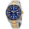 Stainless steel case with a stainless steel Rolex oyster bracelet with 18kt yellow gold center links. Uni-directional rotating 18kt yellow gold bezel with a blue cerachrom (count-up elapsed time) top ring. Blue dial with luminous yellow gold hands and dot hour markers. Minute markers around the outer rim. Dial Type: Analog. Date display at the 3 o’clock position. Rolex calibre 3235 automatic movement, based upon Rolex 3035, containing 31 Jewels, bitting at 28800 vph, and has a power reserve of approximately 70 hours. Scratch resistant sapphire crystal. Screw down crown. Solid case back. Round case shape. Case size: 41 mm. Oysterlock clasp. Water resistant at 300 meters / 1000 feet. Functions: date, hour, minute, second, chronometer. Submariner Series. Luxury watch style. Watch label: Swiss Made. Item Variations: M126613LB-0002. Rolex Submariner Blue Dial Stainless Steel and 18K Yellow Gold Bracelet Automatic Men’s Watch 126613LBBLSO.