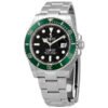 Stainless steel case with a stainless steel bracelet. Uni-directional rotating stainless steel bezel with a green ceramic ring. Black dial with luminous silver-tone hands and index hour markers. Minute markers around the outer rim. Dial Type: Analog. Luminescent hands and markers. Date display at the 3 o’clock position. Rolex calibre 3235 automatic movement, based upon Rolex 3035, containing 31 Jewels, bitting at 28800 vph, and has a power reserve of approximately 70 hours. Scratch resistant sapphire crystal. Screw down crown. Solid case back. Round case shape. Case size: 41 mm. Oysterlock clasp. Water resistant at 300 meters / 1000 feet. Functions: date, hour, minute, second, chronometer. Submariner Series. Luxury watch style. Watch label: Swiss Made. Item Variations: M126610LV-0002. Rolex Submariner “Kermit” Automatic Chronometer Black Dial Men’s Watch 126610LVBKSO.