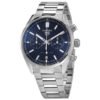 Stainless steel case with a stainless steel bracelet. Fixed stainless steel bezel. Dark blue dial with luminous silver-tone hands and index hour markers. Arabic numeral minute markers (at 10 minute intervals). Minute markers around the outer rim. Dial Type: Analog. Luminescent hands and markers. Date display at the 6 o’clock position. Chronograph – three sub-dials displaying: 60 second, 12 hours and 30 minutes. Heuer calibre 02 automatic movement, containing 33 Jewels, composed of 168 parts, bitting at 28800 vph, and has a power reserve of approximately 75 hours. Scratch resistant sapphire crystal. Pull / push crown. Transparent case back. Round case shape. Case size: 42 mm. Deployment clasp with a push button release. Water resistant at 100 meters / 330 feet. Functions: chronograph, date, hour, minute, second. Carrera Series. Casual watch style. Watch label: Swiss Made. Tag Heuer Carrera Chronograph Automatic Men’s Watch CBN2011.BA0642.