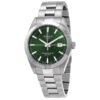 Stainless steel case with a stainless steel bracelet. Fixed stainless steel bezel. Green dial with luminous silver-tone hands and index hour markers. Minute markers around the outer rim. Dial Type: Analog. Luminescent hands and markers. Date display at the 3 o’clock position. Powermatic 80.811 automatic movement, based upon ETA 2824-2, containing 25 Jewels, bitting at 21600 vph, and has a power reserve of approximately 80 hours. Scratch resistant sapphire crystal. Transparent case back. Round case shape. Case size: 40 mm. Case thickness: 11.5 mm. Band width: 21 mm. Fold over clasp with a safety release. Water resistant at 100 meters / 330 feet. Functions: date, hour, minute, second. Powermatic 80 Silicium Series. Dress watch style. Watch label: Swiss Made. Tissot Powermatic 80 Silicium Automatic Green Dial Men’s Watch T127.407.11.091.01.