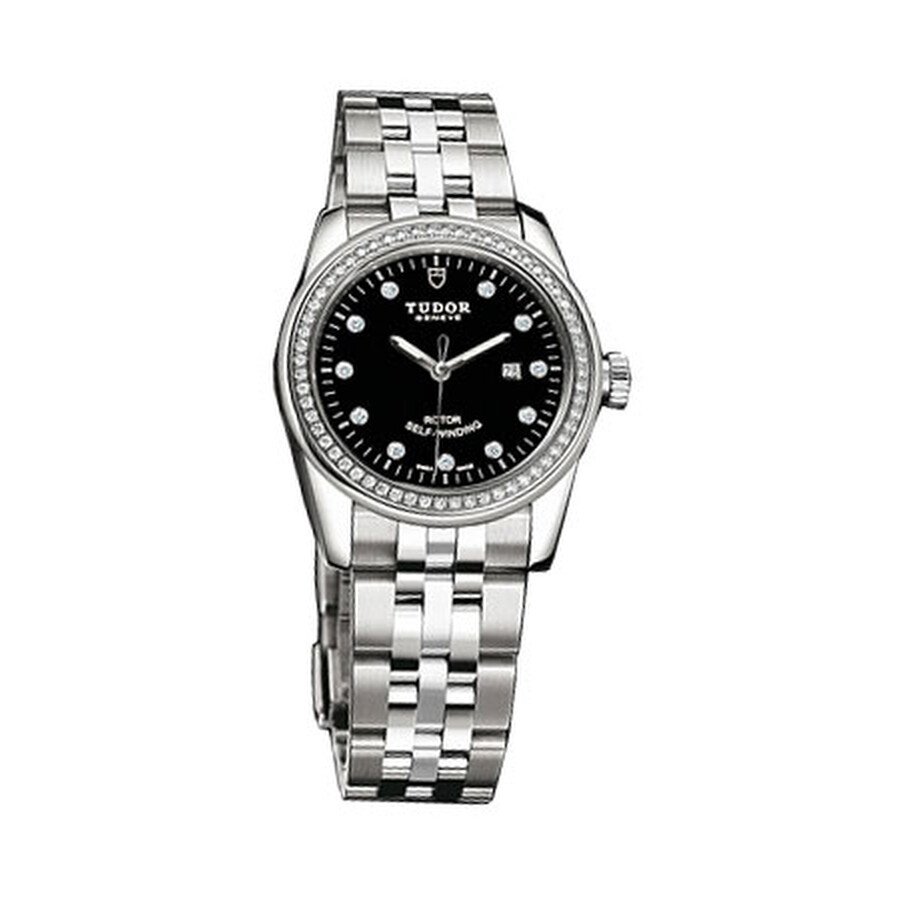Silver-tone stainless steel case and bracelet. Fixed silver-tone stainless steel set with diamonds bezel. Black dial with silver-tone hands and diamond hour markers. Minute markers around the outer rim. Dial Type: Analog. Luminescent hands. Date display at the 3 o’clock position. Tudor Calibre T201 Automatic movement, based upon ETA 2671, containing 25 Jewels, bitting at 28800 vph, and has a power reserve of approximately 38 hours. Scratch resistant sapphire crystal. Screw down crown. Solid case back. Round case shape, case size: 31 mm. Deployment clasp. Water resistant at 100 meters / 330 feet. Functions: date, hour, minute, second. Glamour Series. Dress watch style. Watch label: Swiss Made. Tudor Glamour Automatic Diamond Black Dial Ladies Watch 53020-0007.