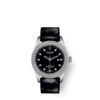 Silver-tone stainless steel case with a black leather strap. Fixed silver-tone bezel with diamond set. Black dial with silver-tone hands and diamond hour markers. Minute markers around the outer rim. Dial Type: Analog. Date display at the 3 o’clock position. Tudor Calibre T201 Automatic movement, based upon ETA 2671, containing 25 Jewels, bitting at 28800 vph, and has a power reserve of approximately 38 hours. Scratch resistant sapphire crystal. Screw down crown. Solid case back. Round case shape, case size: 31 mm. Fold over clasp with a safety release. Water resistant at 100 meters / 330 feet. Functions: date, hour, minute, second. Additional Info: steel double bezel set with 60 diamonds, with polished finish. Glamour Date Series. Luxury watch style. Watch label: Swiss Made. Item Variations: M53020-0048. Tudor Glamour Date Automatic Diamond Black Dial Ladies Watch 53020-0048.